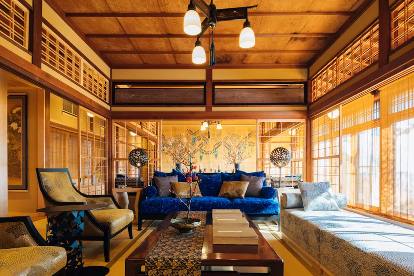 築87年の豪奢な伝統建築を改修し、耐震ならびに住宅性能を高め、オリジナルの意匠を生かしつつ、金と青をキーカラーに、琳派を思わせる華やかなデザインに仕上げています。例えば100枚以上の障子戸は、伝統の洗いを施し、85平方メートルのLDKの緩い結界として再生させました。私設美術館も所有する美術篤志家のオーナー一族が、何代にもわたりこの家のために集めた美術品が新しい空間デザインの中で煌めくさまは圧巻です。
