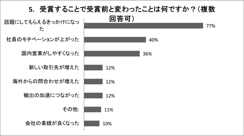 ※1 「話題にしてもらえるきっかけになった」77%、「国内営業がしやすくなった」36%、「新しい取引が増えた」12%、「海外からの問い合わせが増えた」12%、「輸出の加速につながった」12%を合計すると全体の約7割が国内外の営業支援、販促促進につながったという結果になりました。