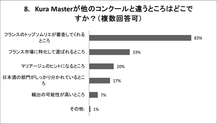 約8割の蔵元が、「フランスのトップソムリエが審査してくれるところ」(83%)と答え、次いで「フランス市場に特化して選ばれるところ」33%と回答し全体の約7割に及んでいます。フランスに特化している本コンクールの特性が、日本の蔵元のニーズに合っていると言えます。