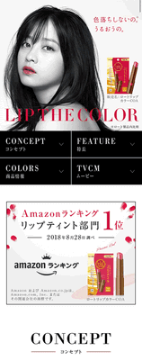 冒頭に印象的な赤いリップを付けたタレントさんのお写真を配置、その下に「コンセプト」「特長」「商品情報」「ムービー」と4つのみに絞ったメニューが大きく配置されています。またそのさらに下には、製品のアピールポイントが写真と文字でスマホからも見やすいデザインで紹介されています。