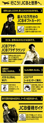 JCBカードユーザーが海外旅行の際に利用できるサービスなどがまとめられたLP。ブラックとイエローのはっきりとしたコントラストで屋外でも見やすいデザインになっています。