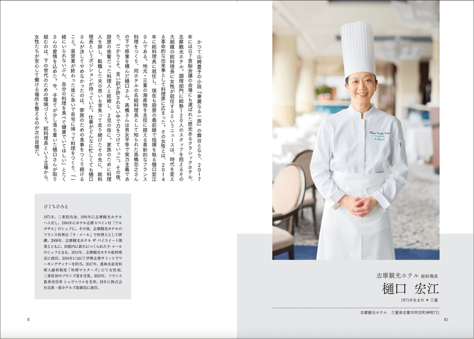 2017年にはG7首脳会議の会場にも選ばれた歴史のあるクラッシックホテル、志摩観光ホテル。調理部門に総勢120人のスタッフを抱えるその大組織の総料理長に女性が就任するというニュースは、時代を変える革命的な出来事として広まりました。現在も厨房の最先端で指揮を執る樋口さんは、2児の母。仕事がどんなに忙しくても決してやめなかったのは、家族のために料理を作り続けることだったそう。