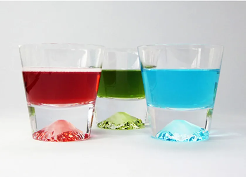 グラスの底には本物に近くデザインされた富士山が。飲み物の色が山肌に反射し、さまざまな表情の変化が楽しめます。