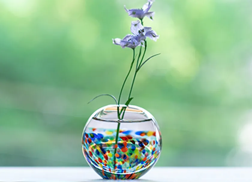祭りの躍動感や高揚感をイメージしたシリーズから一輪挿しを。水を入れるとレンズ効果により、大きな水滴のような美しさです。