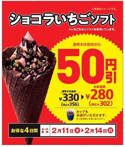 ②バレンタイン期間限定企画:2月11日(木)~14日(日)に「ショコラいちごソフト」50円引き実施