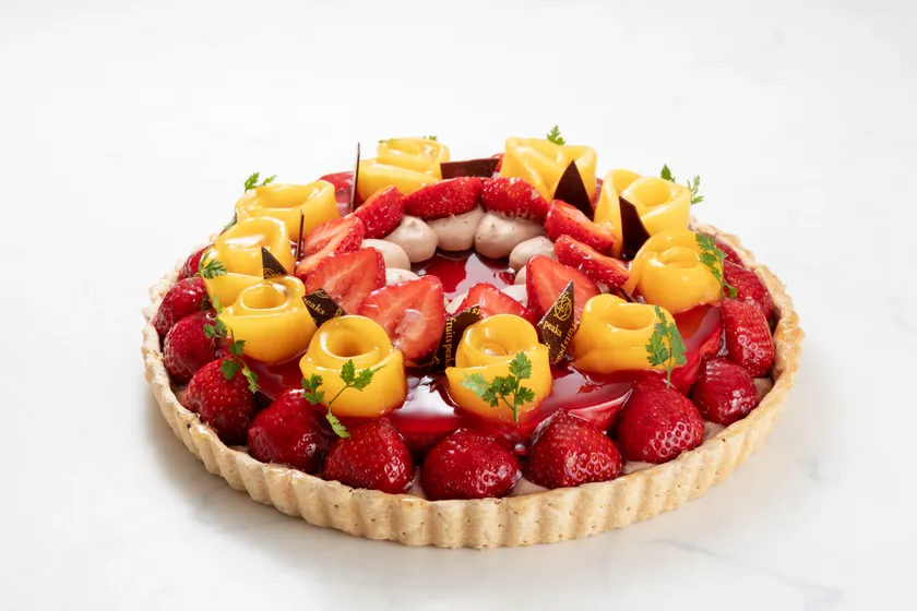 フルーツマイスターが徹底して熟度管理した旬の果物でつくるフルーツピークスのフルーツタルト。バレンタイン限定の『いちごとチョコのムース』の中はいちごを贅沢に使用して作った甘酸っぱさ広がるいちごとチョコの2層のムース。赤いグラサージュでコーティングされたムースの上にはマンゴーのお花といちごが宝石のように並んでいます。いちごの甘さと芳醇なチョコレートの香りが口の中いっぱいに広がる、見た目も断面も繊細で華やかなタルトです。