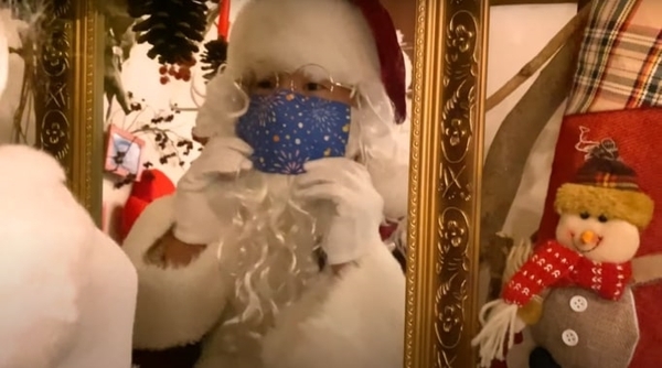 デリバリーサンタを行うサンタクロースは、飛沫感染対策として花火柄のマスクを着用します。子どもにとってサンタクロースと話す時間は、クリスマスの大事なひとときです。マスクを着用したサンタクロースであれば、安心して話すことができます。