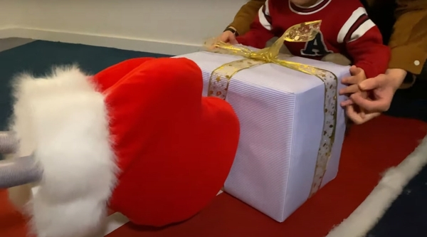 サンタクロースと子どもが立つ位置を示し、2メートルの距離を保つことができる「ディスタンスカーペット」を使用します。さらに、大きなサンタの手をイメージした「ディスタンスハンド」を使い、2メートル先の子どもへプレゼントを渡します。サンタクロースと密接することなく、子どもはプレゼントをもらうことができます。