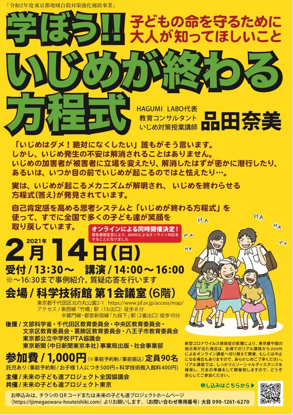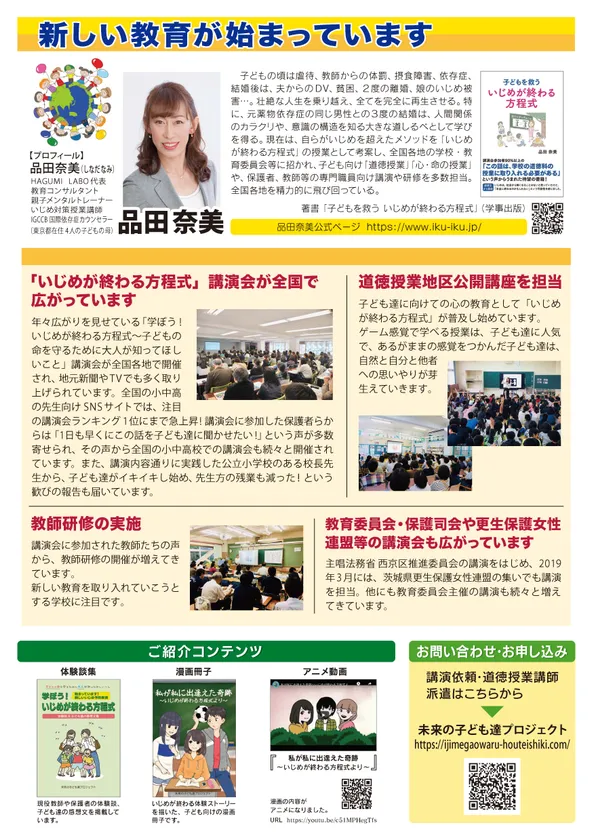 詳細は当団体ホームページおよび『子どもを救ういじめが終わる方程式』(品田奈美 著、学事出版)をご覧ください。