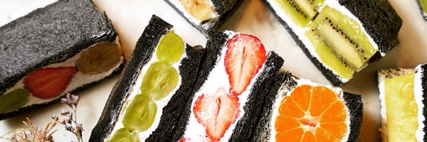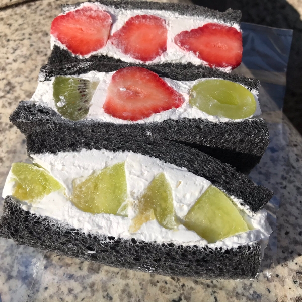 斬新なビジュアルの黒い生食パンは毎朝仙台から直送された契約パン屋さんのものを使用しております。ゴーストレストラン形式で原価をかけた黒いフルーツサンド専門店は日本全国で当店だけになります。黒い色は竹炭を練り込んだ色で、食べることにより体内の毒素を吸着させデトックスがあります。