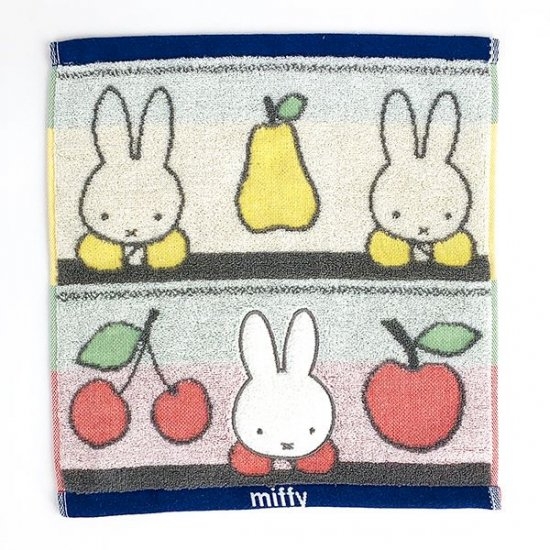 ミッフィーと一緒にリンゴやさくらんぼなど、カラフルなフルーツがデザインされたキュートなタオル。