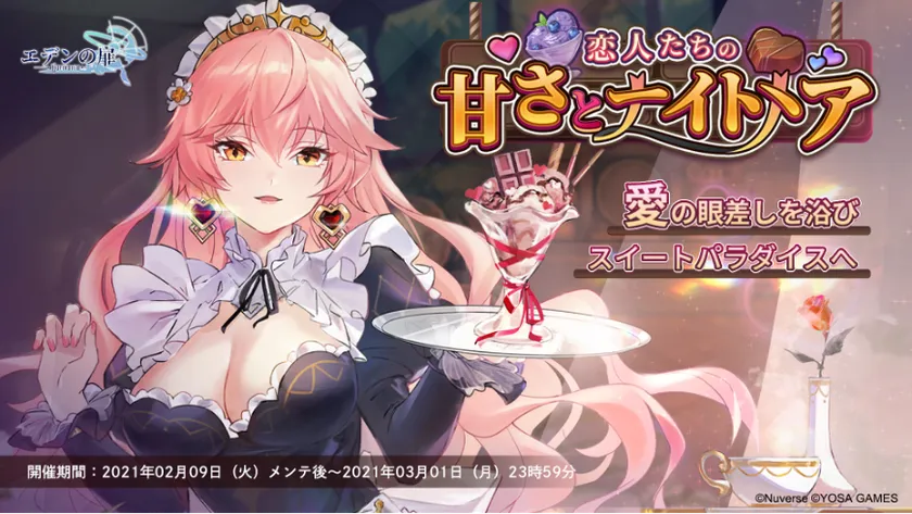 Nuverseは、運営する美少女アクションRPG「エデンの扉」( https://www.edentobi.jp/ )にてバレンタインをテーマとしたイベントを2月9日に開催いたします。「恋人たちの甘さとナイトメア」の甘い挑戦では、プレイヤーにはゲーム内で悪魔・ルシファーを倒して、かわいいかフェのメイド姿へ戻るよう手助けをしてもらいます。それと同時に、バレンタインでサプライズ登場するSSRキャラルシファー・甘美な囁き(CV:釘宮理恵)の為に、バレンタイン限定衣装【蜜ノ味・桃】を獲得できます。