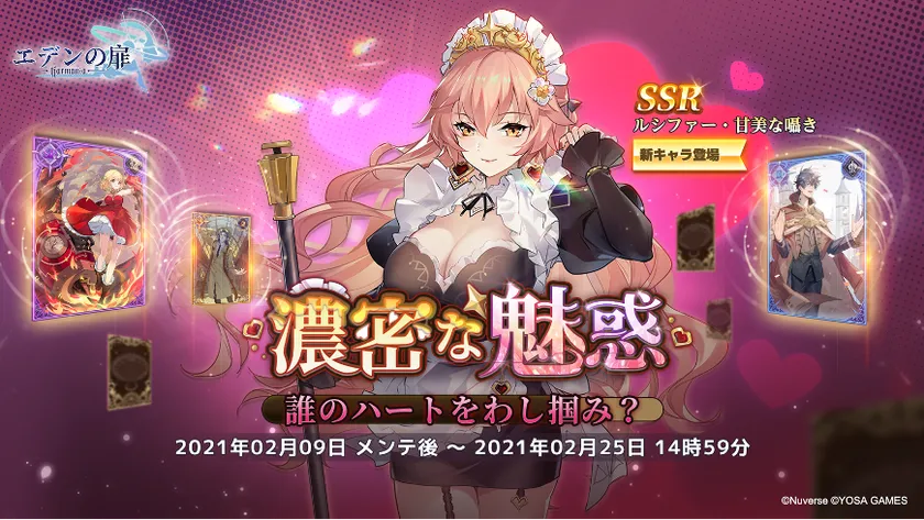 バレンタインの恋する甘酸っぱい雰囲気に合わせて、プレイヤーに新しく登場するSSRキャラをいち早く体験してもらえるよう、「濃密な魅惑」をテーマとするピックアップイベントを実施します。また、SSRキャラルシファー・甘美な囁きの獲得確率も大幅にアップ!また、これ以外にもSSR甘美な囁きのピース、SSR絆カードジョーカー、SR絆カード炎光の中の少女、R絆カード自由意志の獲得確率も上がります。詳細な提供割合については、ゲーム内のお知らせをご確認ください。2021年2月9日メンテナンス後より、ピックアップガチャを開催!ピックアップ期間中、下記キャラクターの提供割合がアップします。