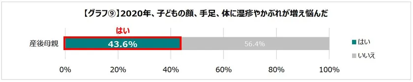 2020年に「子どもの顔、手足、体に湿疹やかぶれが増え悩んだ」と回答した母親は43.6%となり、多くの方が子どもの肌の悩みを抱えていたことがわかりました。[グラフ(9)]