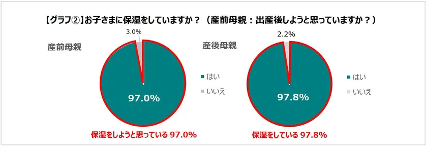 保湿を実践している、またはしようと思っている産前母親は97.0%、産後母親は97.8%と高い割合でした。[グラフ(2)]
