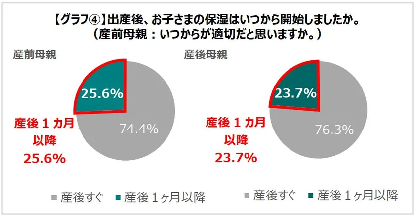 ・肌からのアレルゲン侵入を防ぐには産後すぐからの保湿が重要である中、出産後の保湿開始時期を「産後1ヶ月以降」と回答した産前母親は25.6%、産後母親は23.7%とほぼ4人に1人が遅れて開始していたことがわかった。