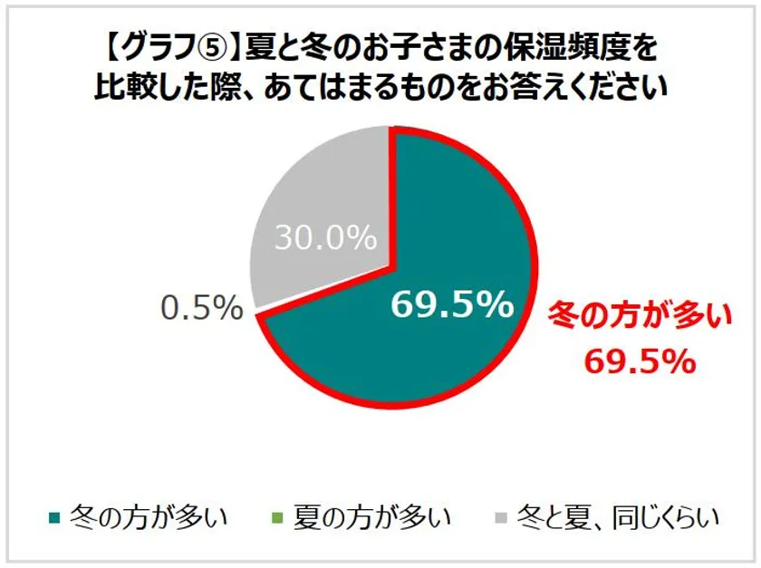 また、産後母親へ夏と冬のお子さまの保湿頻度を比較した際、69.5%が「冬の方が多い」と回答ました。乳幼児の肌は水分の蒸散量が多く、また10歳頃までは皮脂量が少なく乾燥しやすいと言われております。夏冬においても同じ頻度で保湿することが重要である中、季節によって頻度が異なる状況が明らかになりました。[グラフ(5)]