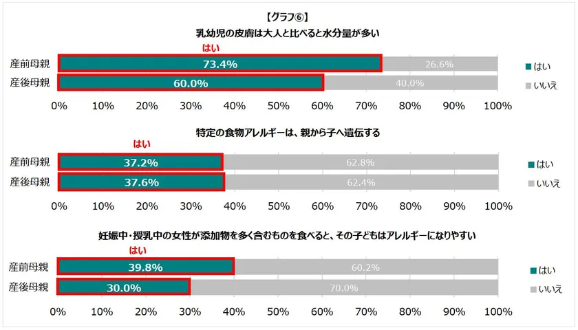 アレルギーや乳幼児の肌の特徴に関する文章の正誤を母親に確認したところ、乳幼児の肌は大人に比べ水分が蒸散しやすいにもかかわらず産前母親73.4%、産後母親60.0%が「乳幼児の皮膚は大人と比べると水分量が多い」と回答し誤った先入観が目立ちました。また、産前母親37.2%、産後母親37.6%が「特定の食物アレルギーは親から子へ遺伝する」、産前母親39.8%、産後母親30.0%が「妊娠中・授乳中の女性が添加物を多く含むものを食べると、その子どもはアレルギーになりやすい」と回答し、こちらも3割以上の方が誤解されていることがわかりました。[グラフ(6)]
