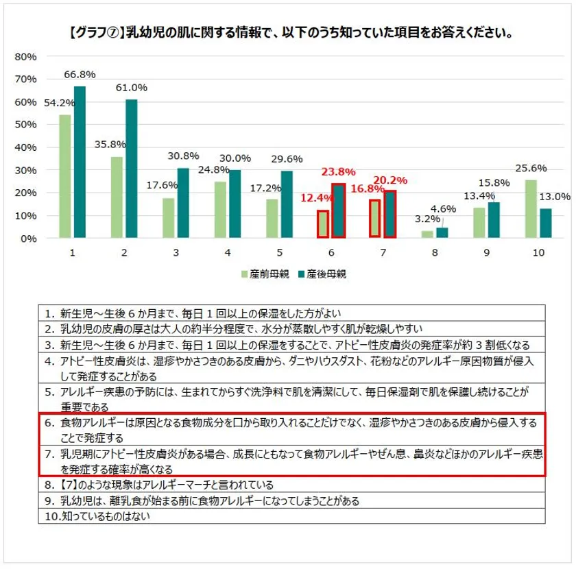 「アレルギーや乳幼児の肌に関する情報」で知っていることを聞いてみると、「食物アレルギーは原因となる食物成分を口から取り入れることだけでなく、湿疹やかさつきのある皮膚から侵入することで発症する」ことを知っている産前母親は12.4%、産後母親は23.8%でした。また、「乳児期にアトピー性皮膚炎がある場合、成長にともなって食物アレルギーやぜん息、鼻炎などほかのアレルギー疾患を発症する確率が高くなる」ことも産前母親は16.8%、産後母親は20.2%と低い結果でした。アレルゲンが肌から侵入しアレルギーを発症する「経皮感作」やアトピー性皮膚炎から複数のアレルギーを連鎖的に発症する「アレルギーマーチ」など、アレルギー予防を正しく実践する上で重要なリスクの理解が不足している実態が明らかになりました。[グラフ(7)]