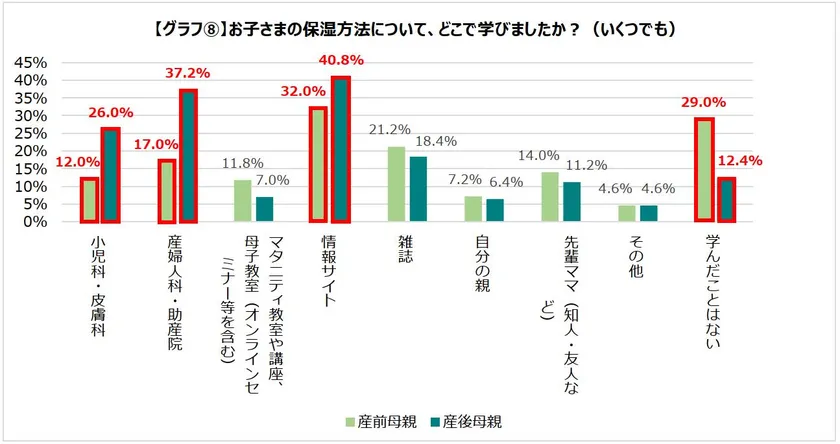 「乳幼児の保湿方法について、どこで学びましたか?」と聞いたところ、産前母親の29.0%、産後母親の12.4%が「学んだことはない」と回答し、保湿について学ぶ機会が不足していると判明しました。保湿は「産後すぐ」行うことが適切と言われている中、産前母親の約3割が保湿について学んでおらず、適切な時期に保湿を開始できていない可能性が明らかになりました。