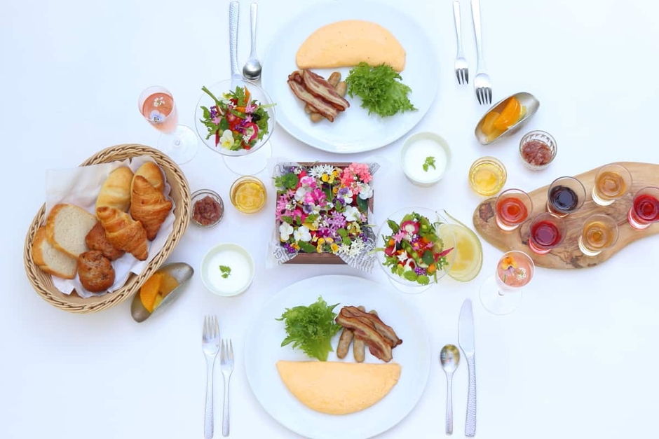 春の花をテーマに、さまざまな方法で花を楽しめる朝食です。乾杯の飲み物では、カーネーション含む4種類のフラワービネガーから好みのものを選び、炭酸水で割った「フラワーサイダー」。食事では、アカシアの花が蜜源植物のハチミツを使用したドレッシングや、コブシの花を丸ごと蜜に漬け込み、香りづけたシロップなどを使用して、花の香りを楽しめます。それぞれの春の花が持つ華やかな香りを堪能できる朝食です。