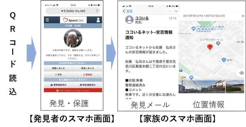 1. 発見者がQRコードを読み取ることで、家族に居場所を伝えます。