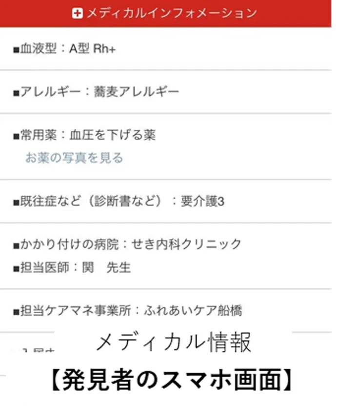 (2) 血液型やアレルギー、服薬情報や既往症等を確認できるため、適切な緊急対応が可能です。また、ペースメーカー等の機器使用、かかりつけ病院や担当ケアマネージャー情報等も事前に登録、確認が可能です。