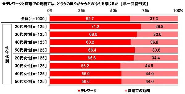 また、テレワークと職場での勤務では、どちらのほうがからだの冷えを感じるか聞いたところ、「テレワーク」は62.7%、「職場での勤務」は37.3%となりました。テレワーク中のからだの冷えに悩んでいる人は多いのではないでしょうか。