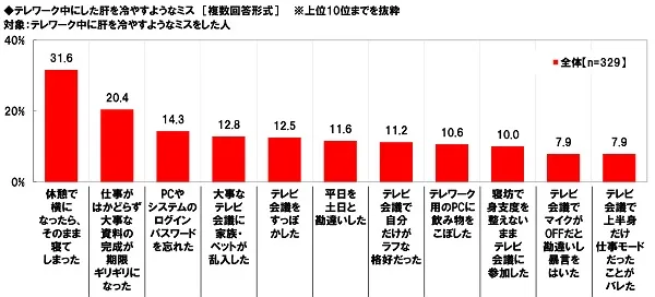 ◆テレワークでやってしまった肝を冷やすミス 1位「休憩で横になってそのまま寝落ち」、