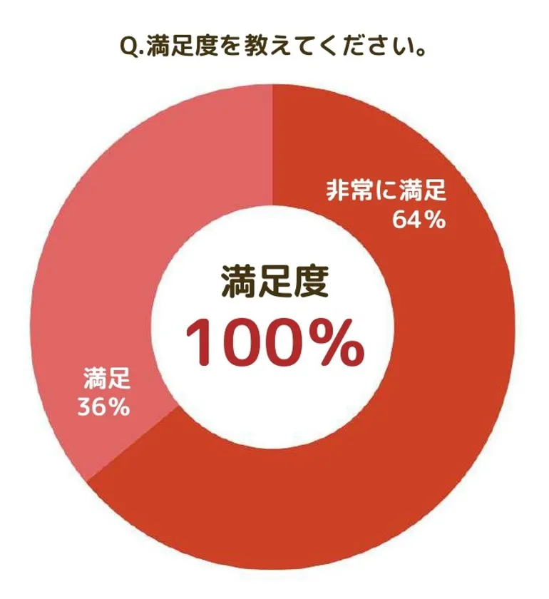 HERIBO WOODユーザーの満足度が100%(非常に満足64%、満足36%、5段階評価)。性能、デザイン、使いやすさ、様々な点から高い評価を受けました。