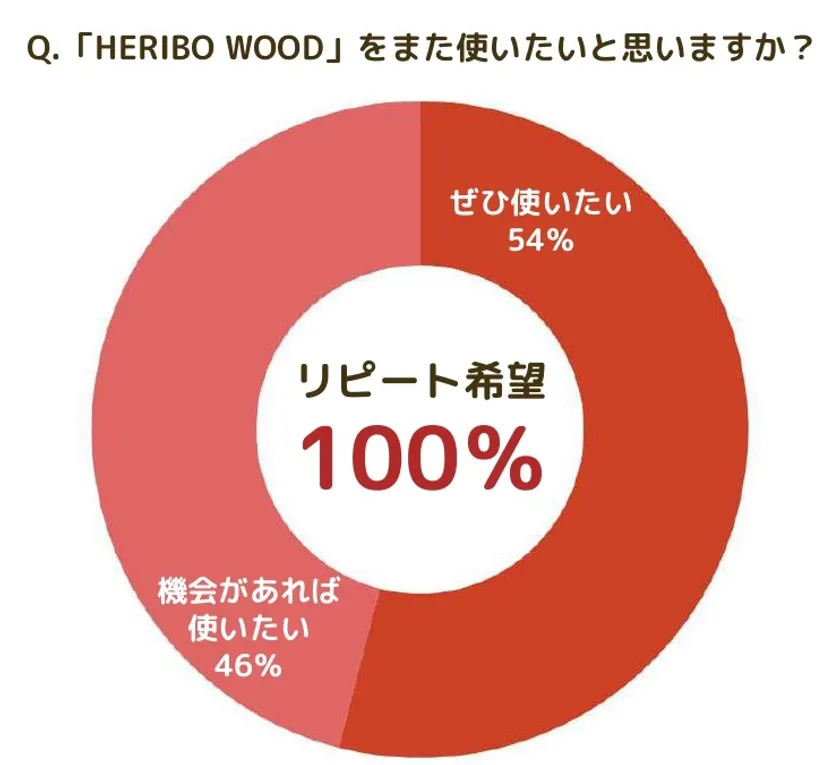 HERIBO WOODユーザーのリピート希望率が100%(ぜひ使いたい54%、機会があれば使いたい46%)。一度使うと、また使いたくなる、魅力的な商品だという評価を受けました。