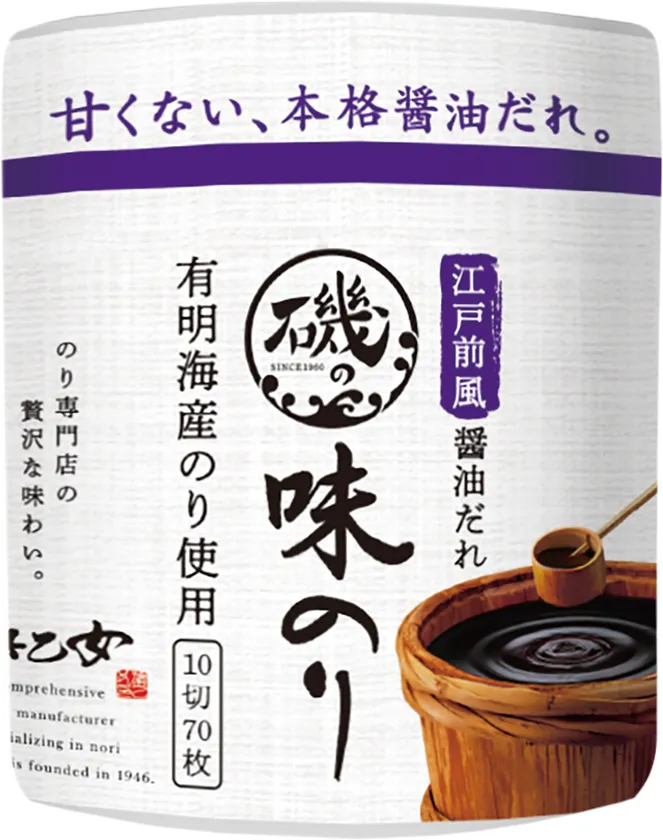 『磯の味のり 江戸前風醤油だれ』は、市場に数多くある「甘辛い」味付けのりと一線を画し、醤油本来の味や風味を大切に演出した味付のりです。炙った香ばしい焼のりを、そのまま醤油につけたような味に仕上げています。