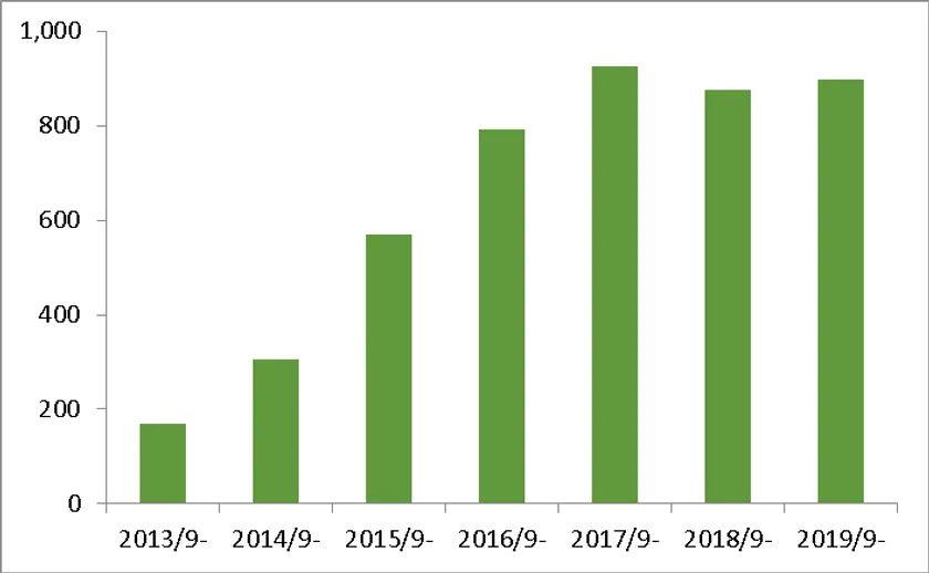 ※出典:インテージSRIカフェインレスRC(簡易含む) 2013年9月~2020年8月累計販売金額(百万円)