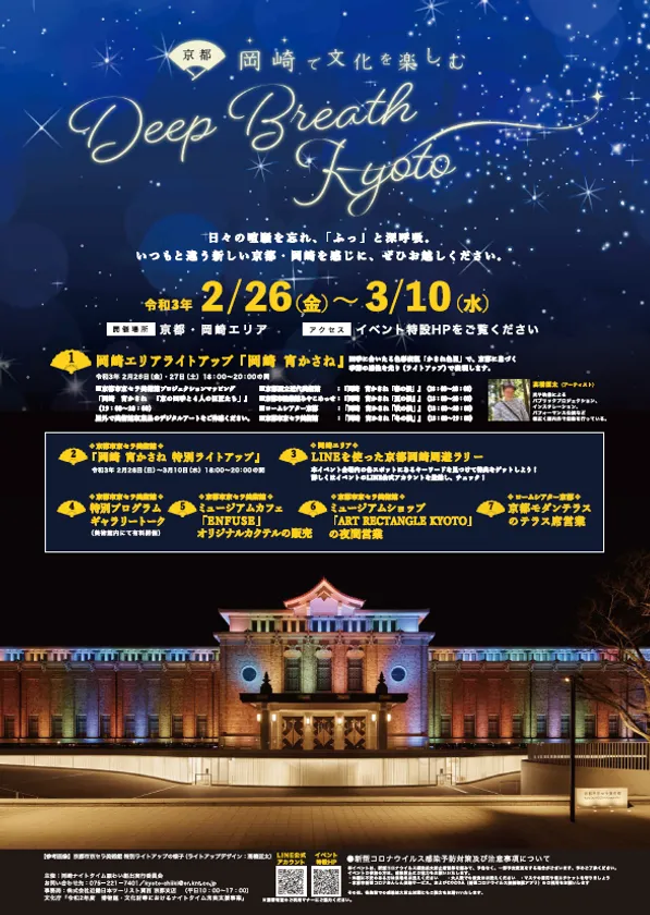 岡崎ナイトタイム賑わい創出実行委員会は、「-京都・岡崎で文化を楽しむ- Deep Breath Kyoto」を2021年2月26日(金)~3月10日(水)まで開催します。