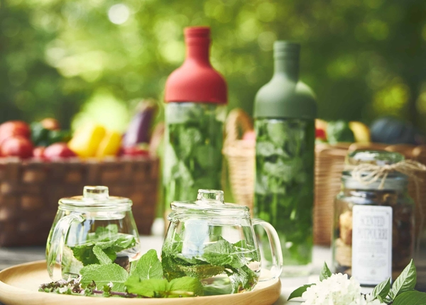 客室では、収穫したハーブをご自身でブレンドする「ハーブティ」と「ハーブウォーター」を楽しみます。お休み前にはリラックスできるハーブを選んで「ハーブティ」を、翌朝には、爽やかな香りのハーブを水に漬け込み、スッキリとした目覚めを促す「ハーブウォーター」を、楽しむことでリフレッシュすることができます。