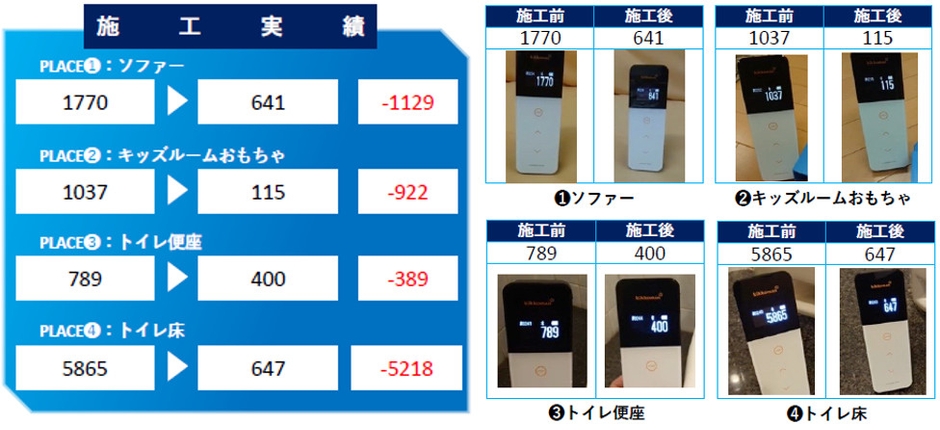 試験方法:ATPふき取り検査(A3法)※で作業前後の汚れの数値を計測したところ、作業前と比べて作業後の数値が大幅に減少しており、高い抗菌・抗ウイルス効果を生んだことが分かります。光触媒は蛍光灯などの光が当たると、抗菌・抗ウイルス作用が発生します。よって、コーティング後は日常生活を送るだけで、この数値はどんどん下がっていきます。