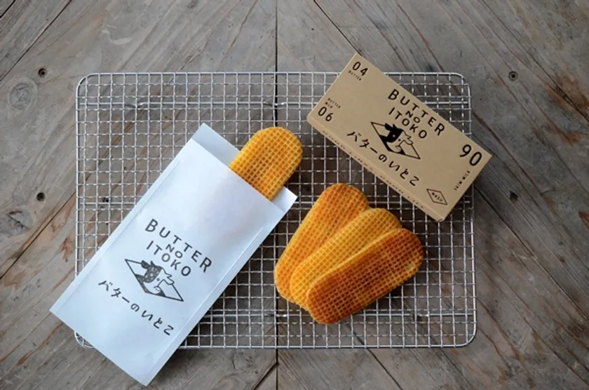 脱脂乳(スキムミルク)を使用した那須銘菓「バターのいとこ」。ミルク感たっぷりのジャムをバターが香り立つゴーフル生地でサンド。「ふわっ・シャリッ・とろっ」の3つの食感がたのしい。