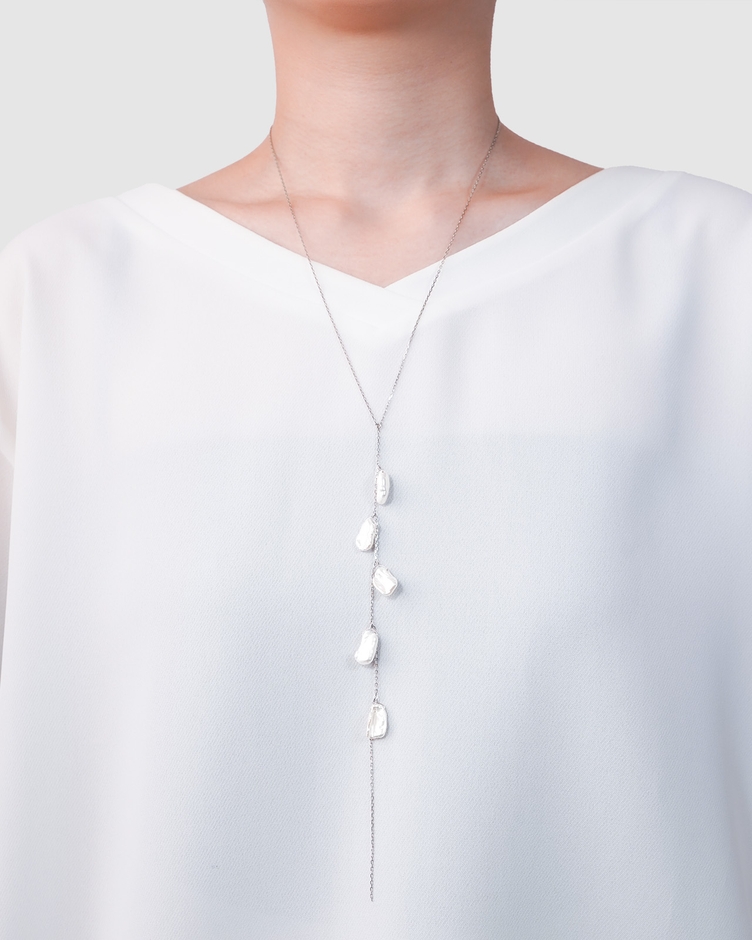 花びらのような淡水パールが軽やかに揺れ動くYチェーンタイプのネックレスとピアスが数量限定で新登場。