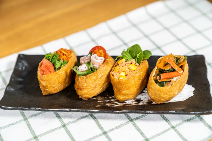 左から順に『韓国風アレンジいなり』『イタリア風アレンジいなり』『アメリカ風アレンジいなり』『和風アレンジいなり』 (photographer 吉田達史)