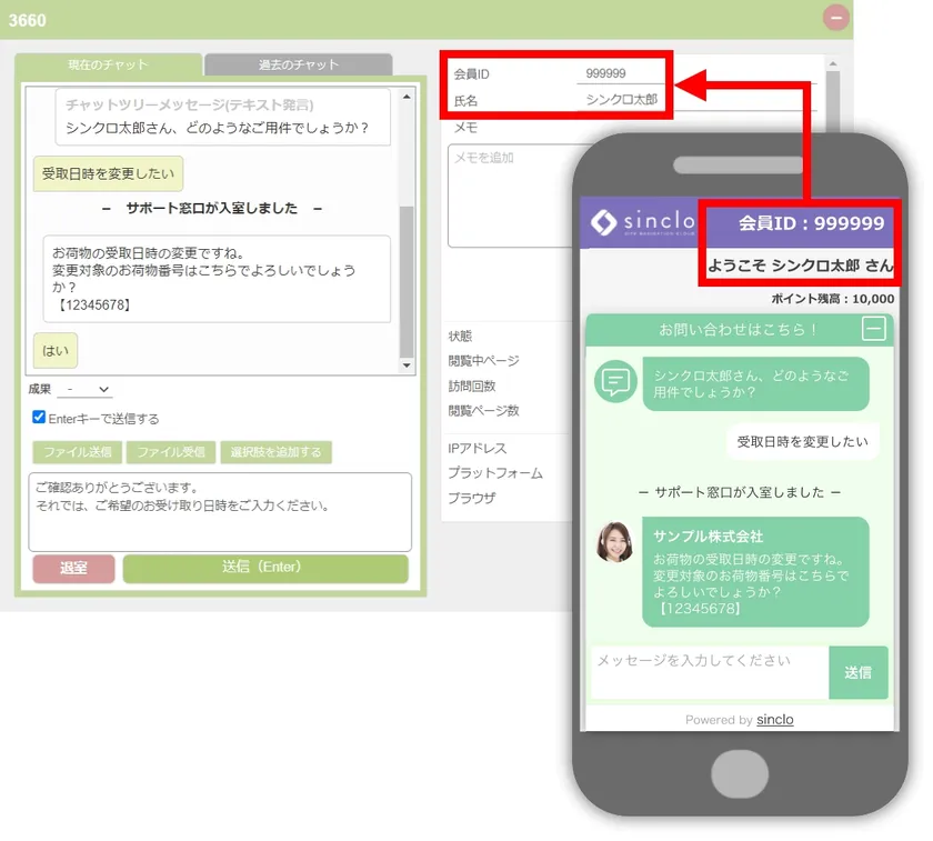 下図のように、チャット問い合わせを利用したユーザーの画面(スマホ画面)から、会員ID(999999)と氏名(シンクロ太郎)をsincloが自動取得し、チャットメッセージの受信画面にこれらの情報とメッセージを表示します。