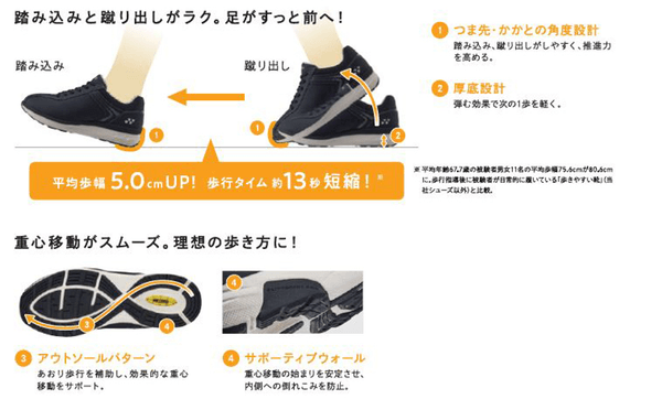 本シリーズは、ロコモティブシンドローム(運動器症候群)の改善に有効とされる理想のウォーキングをサポートする弊社独自のテクノロジー「ロコ・ストライド」を採用。つま先とかかとに角度をつける設計等により、前方への推進力を高め、無理なく自然に歩幅と歩行スピードを向上させ運動効果を高めます。