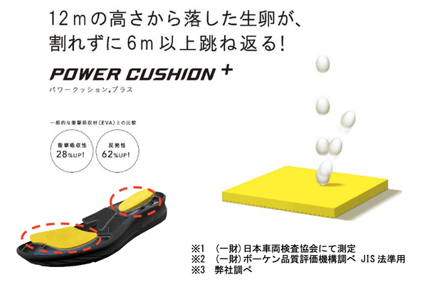 ミッドソールの踏みつけ部とかかと部には、12mの高さから落とした生卵が、割れずに6m以上跳ね返る弊社独自の衝撃吸収反発素材「パワークッションプラス」を搭載し、軽快なウォーキングをサポート。