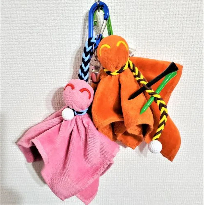 てるてるキャディは、専用のタオルに特許出願中のデザインを刺繍し2か所の穴を開けています。