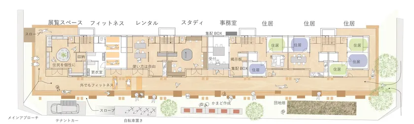 〇1階5住戸程度を学生の利用だけではなく、地域活性化を目的とした共用部として計画