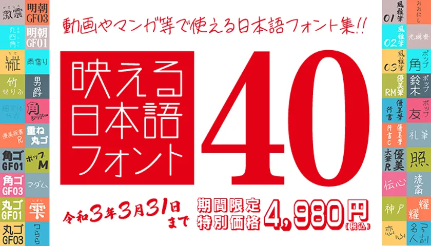 動画・ゲームでも使える39書体を収録した期間限定商品が登場。他社商品では使用が認められないケースの多い、動画やゲームでの使用、サーバーへアップロードも許諾されています。価格は、通常価格の88%OFFとなる5,500円(税込)。2021年3月31日までの期間限定商品です。