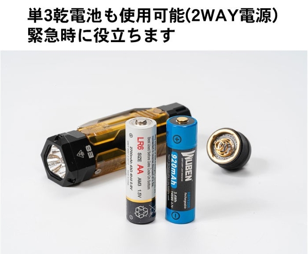 WUBEN【E8】は充電式リチウムイオン充電池に加えて、エネループや市販の単3アルカリ電池も使用可能。