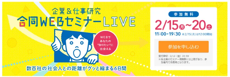 就職活動が始まる3月1日に向けて、企業が具体的な仕事内容や職場の雰囲気を学生に伝える「企業&仕事研究合同WebセミナーLIVE」を開催します。2月15日から20日までの期間限定で、約500社が参加予定です。動画は生配信と録画の2パターンがあり、生配信の企業には、チャットを使って学生からタイムリーに質問することも可能です。