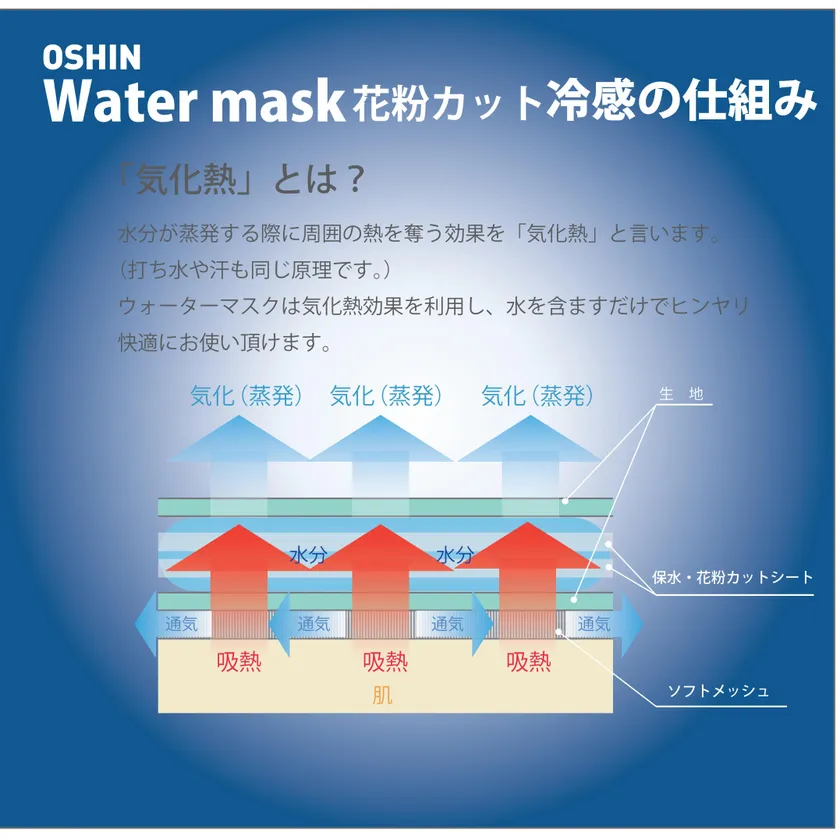 マスク内に保水兼花粉カットシートを内蔵し、暑い時はマスクを水に浸し絞って装着します。