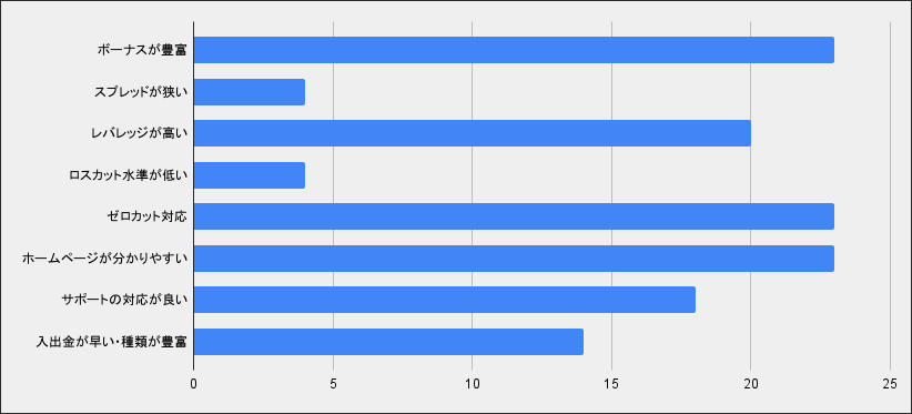 TitanFXはボーナスがないため、選ぶ人はいませんでしたが、「スプレッドが狭い」にチェックをした人がほとんどでした。