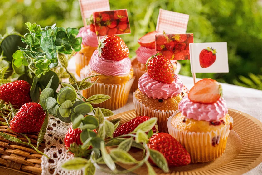 クランベリーを練り込んだ苺風味のカップケーキにクリームと苺をのせた、幸福感が凝縮された一品